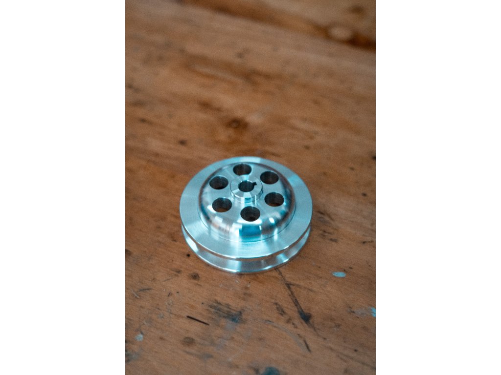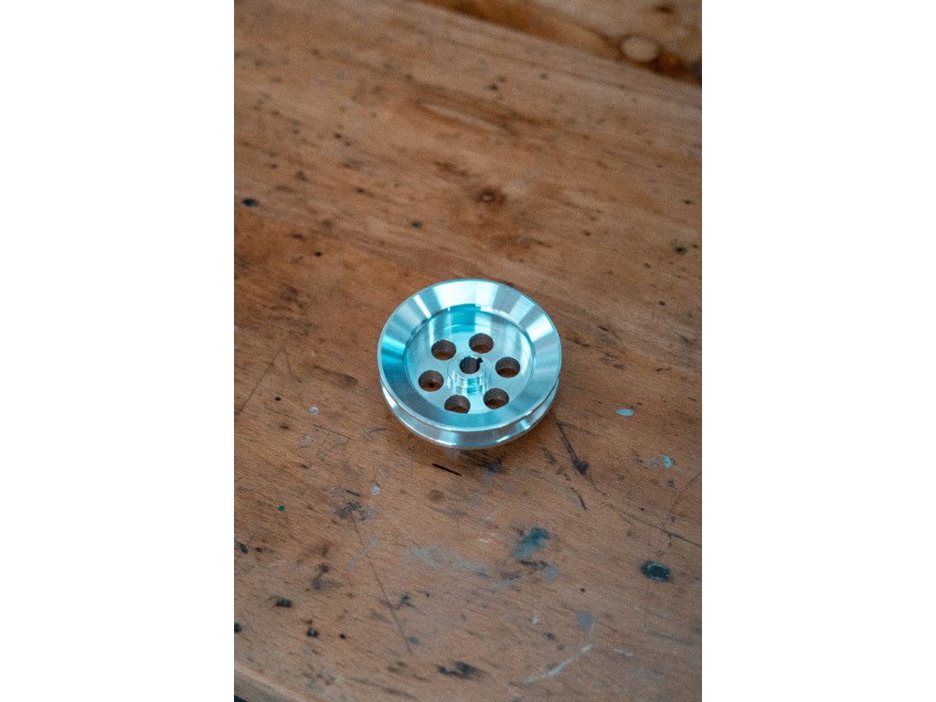 Řemenice vodní pumpy, která je vyrobena z hliníku.